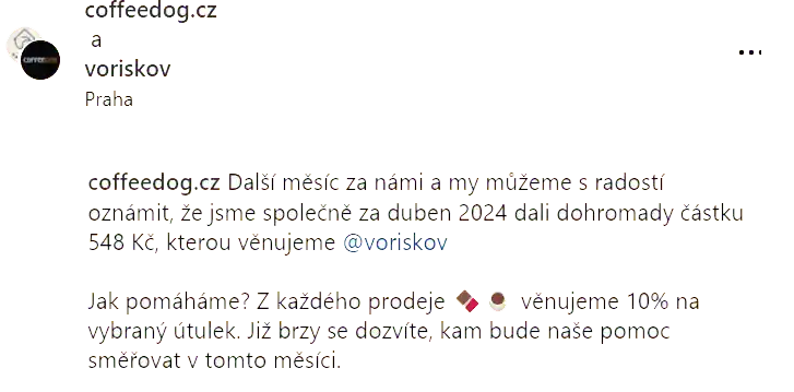 Rádi bychom dali kávě přidanou hodnotu. Naše vášně spojené s kávou nás vedly k tomu, abychom vytvořili nejen kvalitní zrnkovou kávu, ale také abychom podpořili útulky a organizace, které pečují o opuštěná a zvířata v nouzi. Každým nákupem pomůžeme zvířatům v útulcích. Pošleme jim 5% z každého prodaného zboží.