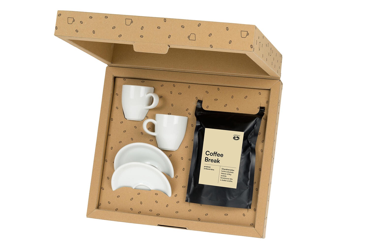 Dárkové balení pro kávové nadšence obsahuje 2 porcelánové hrníčky na espresso Luka s podšálkem a 150 g balení zrnkové kávy Coffee Break – originální směs tří káv typu arabika a robusta, které jsou pečlivě vybrány pro přípravu espressa a pro mléčné nápoje na bázi espressa.
