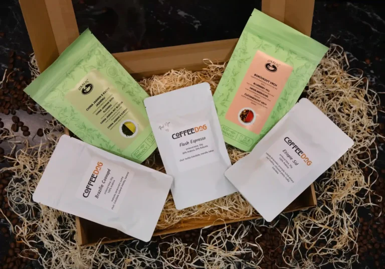 Degustační dárkové balení 300g prémiové kávy Coffeedog a čajů Oxalis.