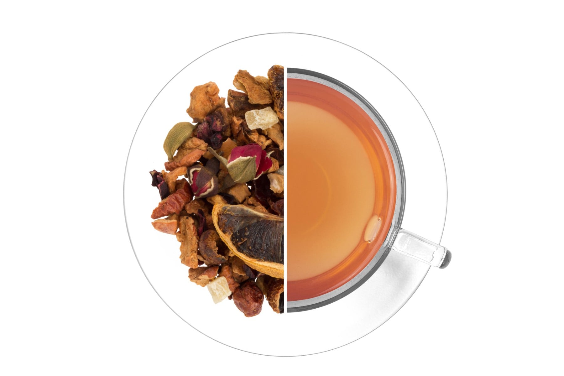 Jablka, rozinky (rozinky, slunečnicový olej), šípek, ibišek, ananas (ananas, cukr, regulátor kyselosti kyselina citrónová), skořice, poupata růží, citronové plátky, aroma, červený rybíz, hřebíček, kardamom plod, přírodní aroma. Může obsahovat stopy skořápkových plodů.