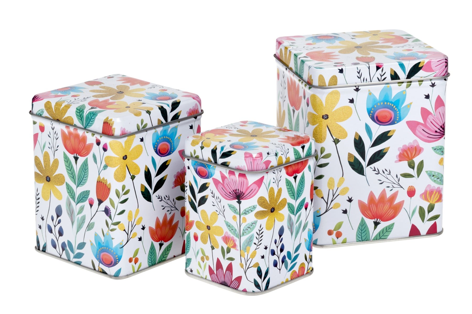 Praktická sada tří plechovek v jednotném designu s barevnými květy. Obsahuje malé, střední a velké provedení, takže se hodí na různé druhy čajů nebo jiných dobrot.