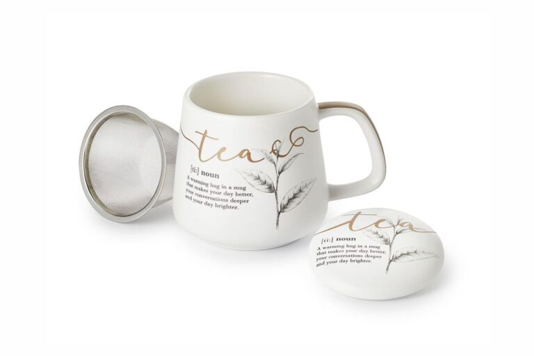 Stylový porcelánový šálek se zlatým nápisem „tea“ a jemným dekorem lístků. Součástí je víčko a nerezové sítko, díky kterým si pohodlně připravíš svůj oblíbený sypaný čaj. Objem – 400 ml.