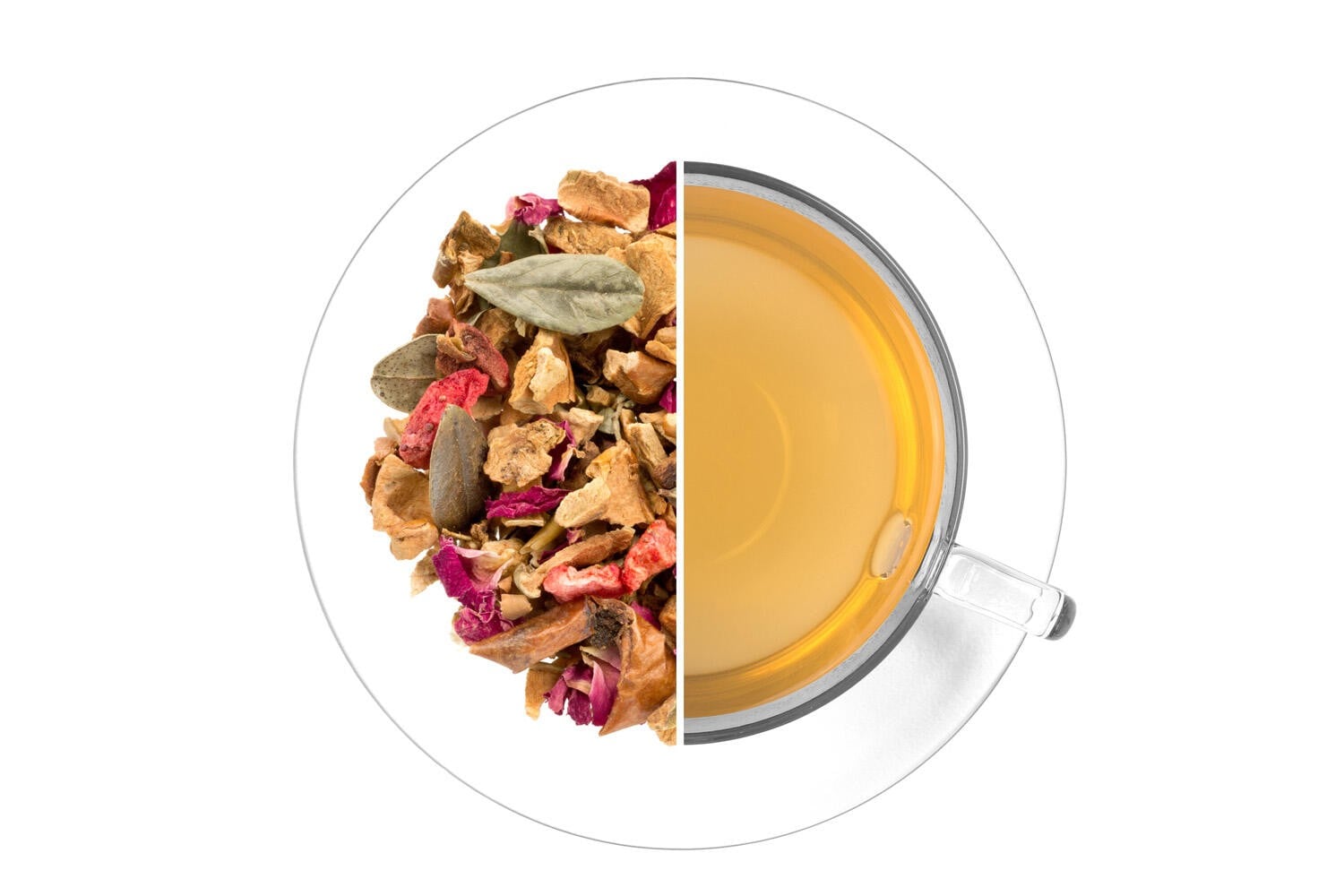 Jablka, citrónová kůra, jahody (6,5 %), květy růže, aroma, list brusinky. Může obsahovat stopy skořápkových plodů.