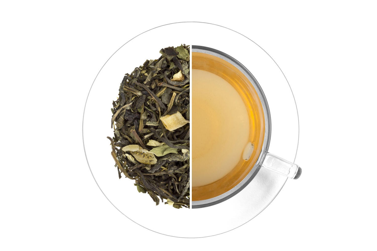 Pravý zelený čaj China Jasmin s květy (78,6 %), mango (15,2 %) (mango, cukr, regulátor kyselosti kyselina citrónová), aroma, nana-máta list. Může obsahovat stopy skořápkových plodů.