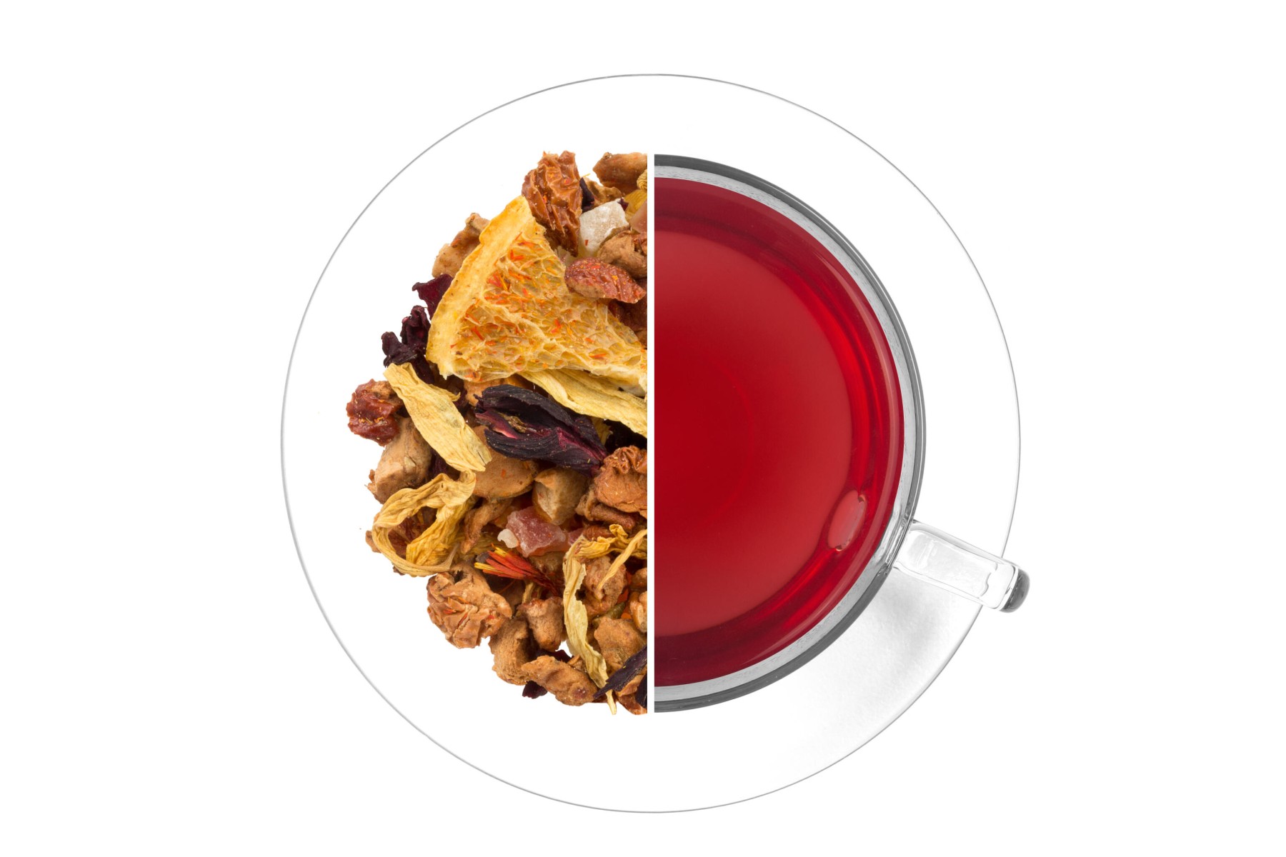 Jablka, papája (papája, cukr), červená řepa, mango (mango, cukr, regulátor kyselosti kyselina citrónová), pomerančové plátky a kůra, ibišek, aroma, slunečnice květ, světlice barvířská květ. Může obsahovat stopy skořápkových plodů.